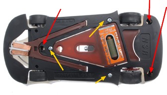 Et ça tourne 3 bons dixièmes de moins que la 997, ce qui a mon avis s'explique en partie par la fixation de la carrosserie triangulée dans le même sens que le support moteur et le triangle guide/roues arrières. Tout est ainsi articulé dans le même sens à l'inverse de la 997 dont la carrosserie est fixée par 2 vis à l'avant et 1 à l'arrière. ( même constat avec la GT40 MK II ).