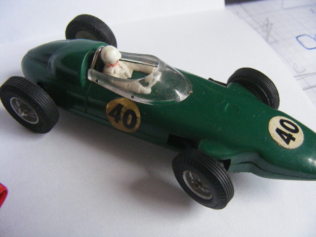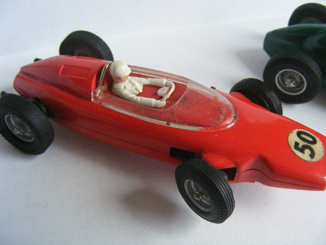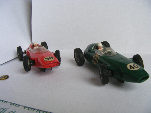 Ce sont des Jouefs, une BRM et une Ferrari. Il n'y a pas l'échelle mais à vue de nez : 1/43 ème. Elles sont dans leur jus. Je dois les nettoyer et recoller un numéro sur la rouge.