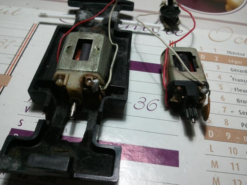 Puis j'ai raccourci l'axe moteur (trop long) remonté un pignon 9 dents ,et raccourci le tout pour l'appareillage avec le train arrière Ninco) lui aussi légèrement re travaillé au niveau des épaulement de la gorge.