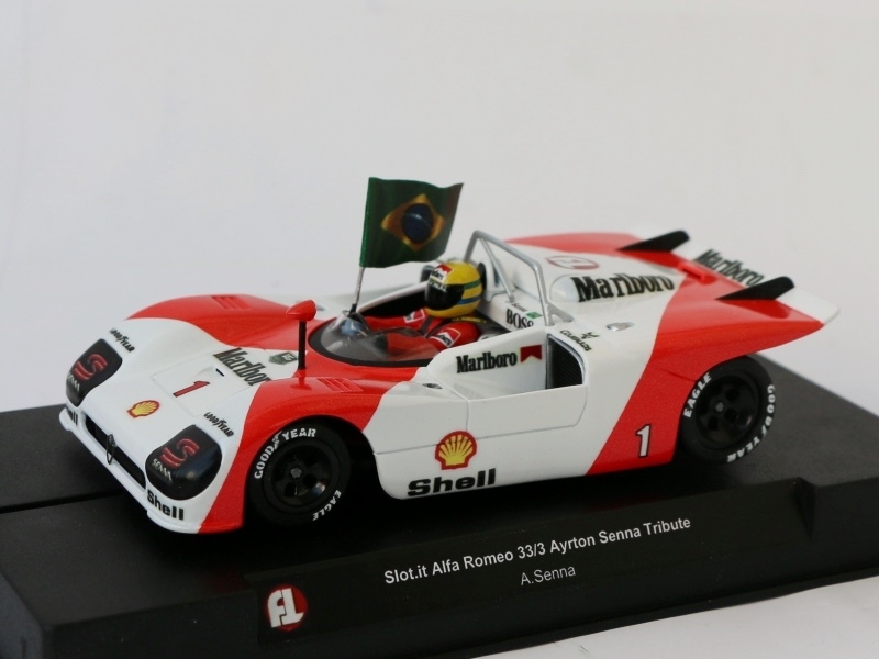 L'Alfa 33 Slot.it, avec son empatement court, est aussi très agréable et agile sur les pistes domestiques. Ici dans une déco hommage à Senna que j'ai réalisée il y a deux ou trois ans: