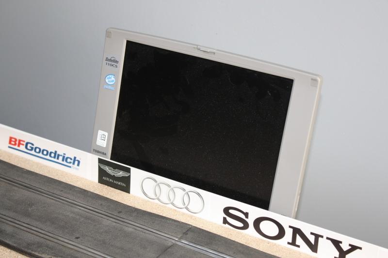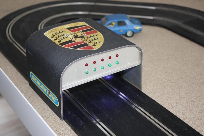 Le tunnel est simplement une plaque d'alu. pliée avec 2 flans. J'ai intégré 2 LED blanche pour éclairer 2 LED infra-rouge pour la détection, simple et très efficace. J'ai aussi intégré des LED rouges et vertes pour les feux de départ, elles ne sont pas encore connectées. Pour l'habillage, j'ai collé un simple photo-montage. Le tout est connecté sur un vieux PC portable, (très vieux, de 1994), il fonctionne à merveille, pour cet utilisation.