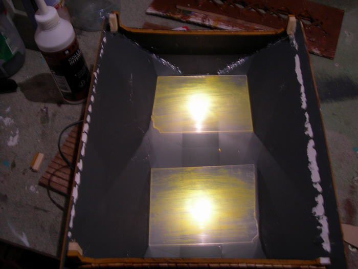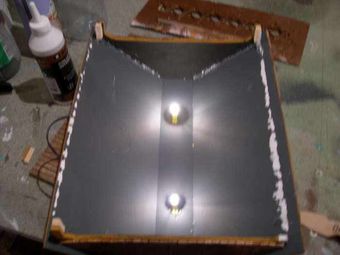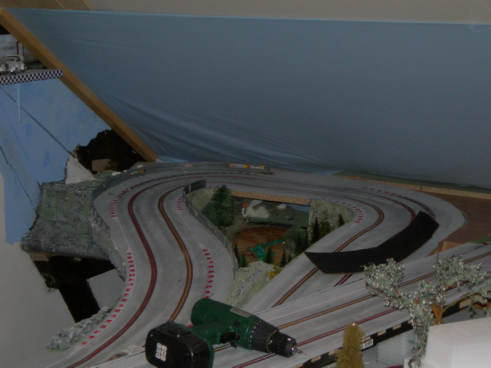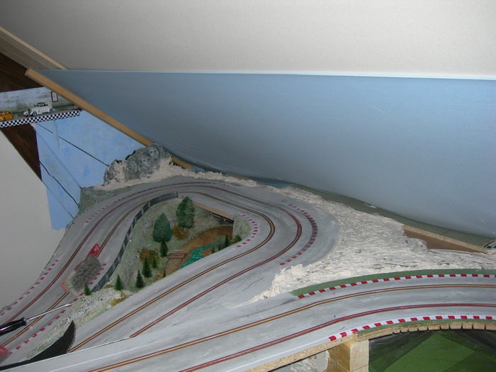 ensuite, pour faire un fond de ciel, j'me suis dit, j'vais mettre du tissu bleu sur lequel je vais peindre des nuages ! bin, les nuages, j'y suis pas arrivé ! a l'aero, ça se voit pas, et au pinceau ! ça rend rien ! donc, se sera juste bleu (mieux que rien !!!) par contre, j'ai pas pu mettre le tissu sans tout casser !!!!