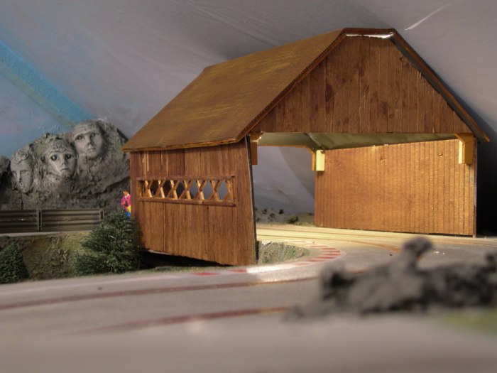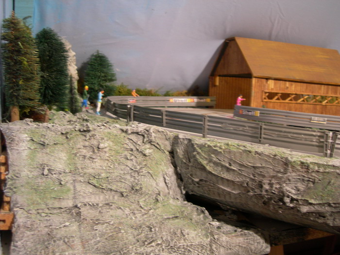 aujourd'hui, j'ai peint en bleu la latte de bois, j'ai retendu un poil le tissu, j'ai posé le pont, peint tout les nouveaux rochers en noir, puis, une fois sec, en gris foncé .......