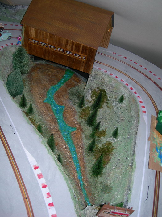 tu prends du vert ou du bleu (selon ton choix de départ), tu le dilue avec du médium. tu peints (en tappottant) ta rviere avec, de l'extérieur vers le centre, en laissant l'extreme centre (je sais ça veut rien dire) plus foncé (= moins de tapotage). Hop, tu laisses sécher, et hop tu recommances, toujours dans le meme sens, jusqu'à finir par faire une couleur, juste sur le bord de la riviere, mélange de la version trés claire de départ (bleu ou vert, donc dans l'exemple) et de la couleur de la terre environnante (marron en l'occurence), et toujours avec du médium dedans. ensuite, de nouveau couche de vernis brillant, ou de vitrifiant.