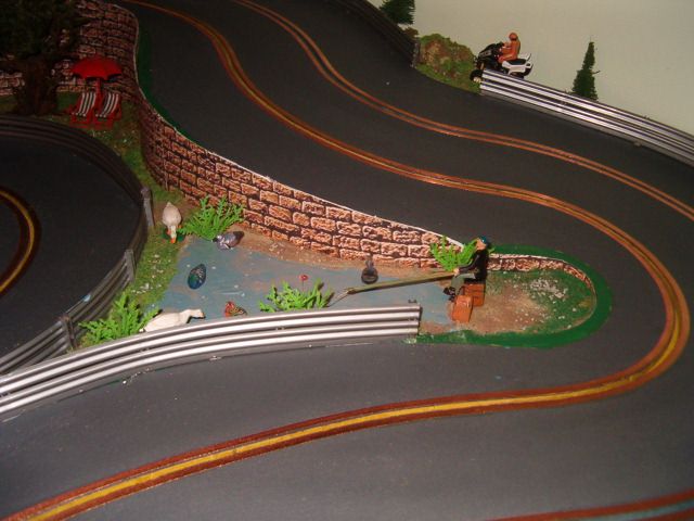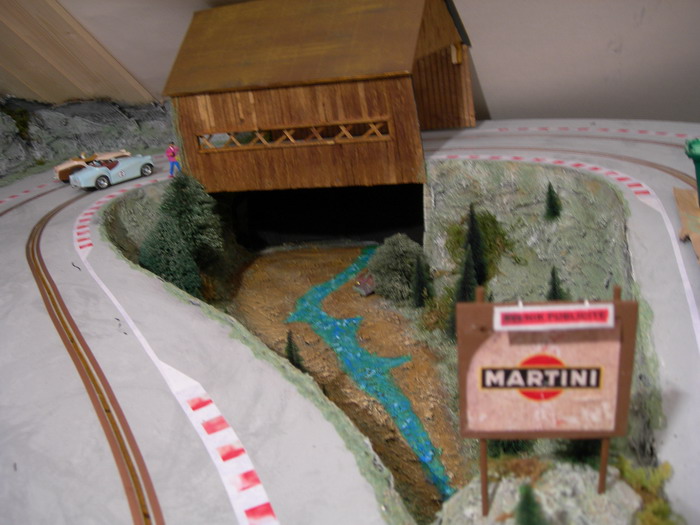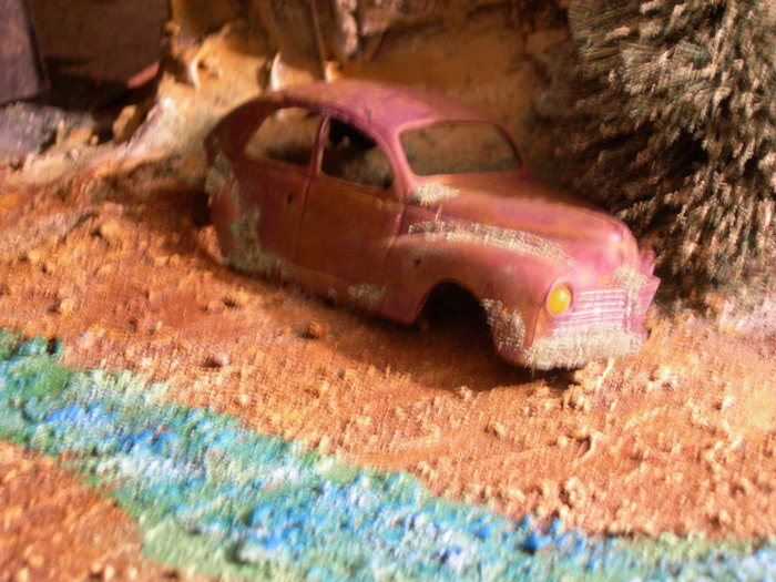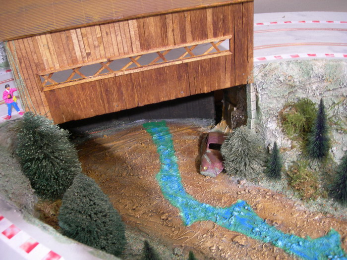 pour finir, à certains endroits, pour les remous, avec un pinceau pourrit bien dur, colles du crépis blanc ou de l'enduit, et sculptes le dans le frais, rajoute autour un peu de flocage mousse ou sable collé à la pva. une fois sec, un coup de brossage blanc : hop des remous dans la flotte.