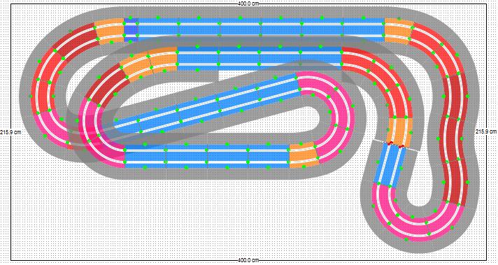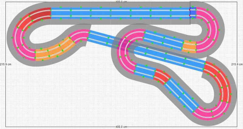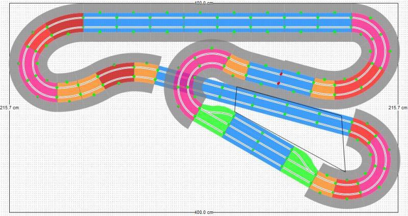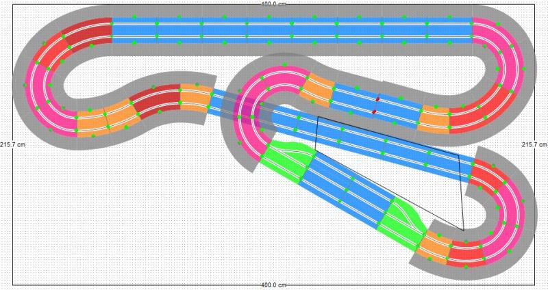 Bon alors avant d'acheter mes courbes manquantes je me suis lancé dans une nouvelle simulation de tracé en tentant de tenir compte de vos indications (faire un "huit" pour avoir la même longueur de piste sur les deux voies, accessibilité, une ligne droite pour les relances,etc...) et de la configuration de ma pièce. Pouvez vous me dire de ce que vous en pensez?