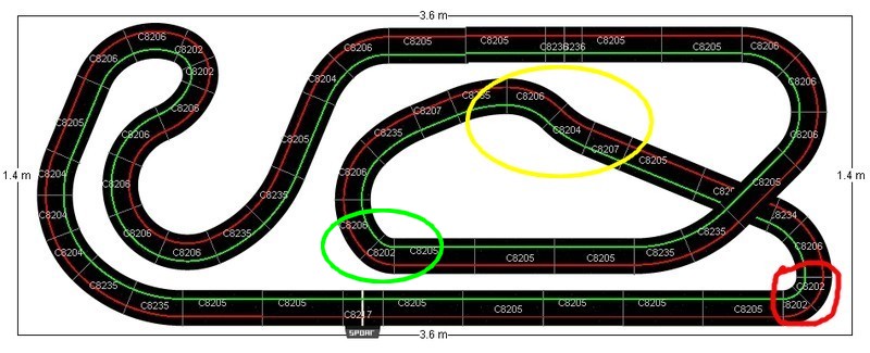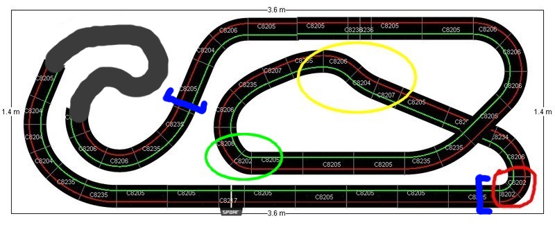 Par contre le virage qui ne te convient pas ne me gêne pas surtout si tu tournes dans le sens horaire, mais celui que j'ai entouré oui. C'est le genre de section qui corrige très bien un tracé qu'on a du mal a boucler mais qui pour moi est un peu casse-gueule. STF l'a placé certainement sans trop regarder car il a pondu ce tracé rapidement comme il précise.