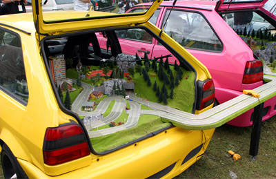sitôt arrivé, le père a viré tous les bagages du coffre pour y monter un petit circuit slot pour ses mômes. le circuit et les deux gamins tenaient à l'aise!