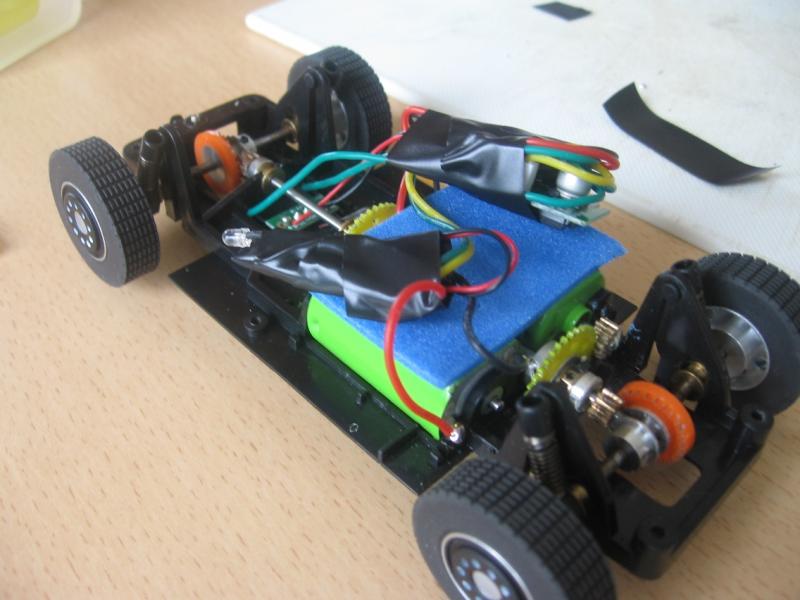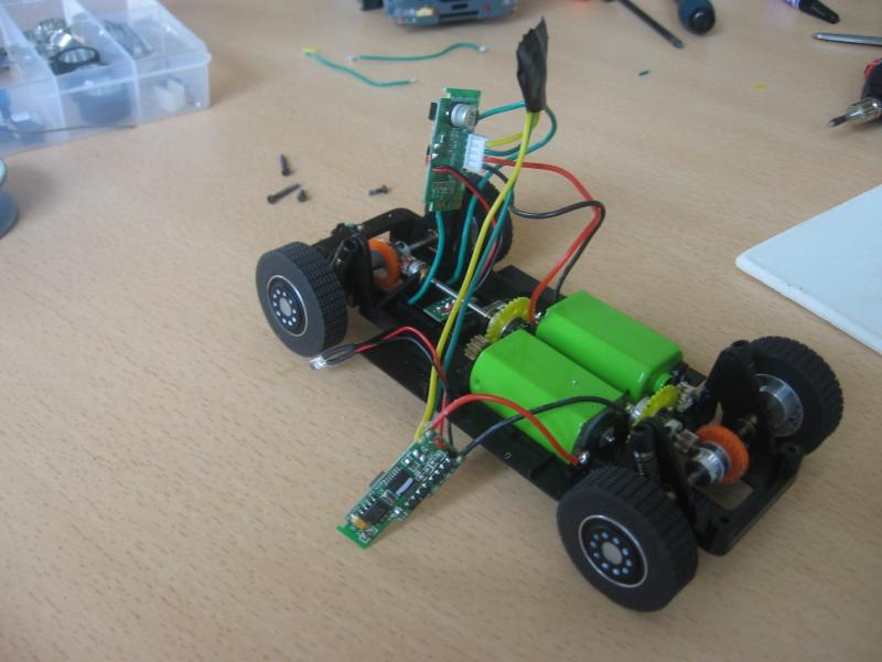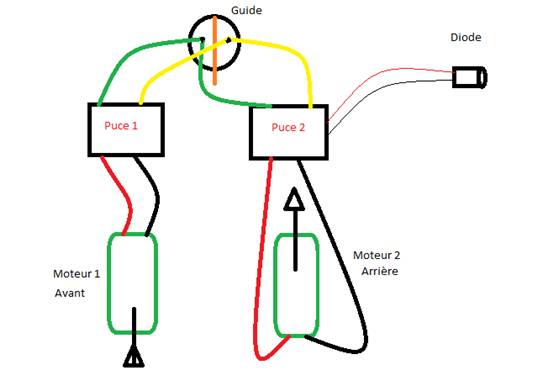 et voici avec les puces,, on sépare les moteurs et on leurs accordent une puce à chacun, on relie les deux fils vert ensemble, les deux jaune ensemble,on positionne une des deux lentilles sur le guide et le tour est joué.