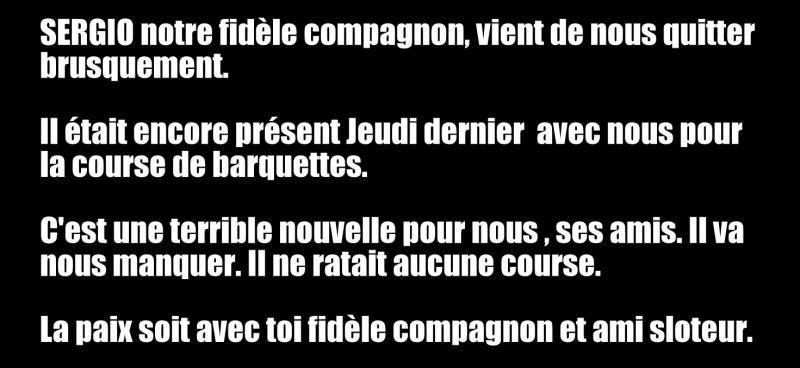 Merci à tous amis sloteurs ...et tous ceux qui l'ont connu. Il ne manquait pas d'humour notre Serge. On en sait un peu plus ce matin / Après une mauvaise chute, les pompiers l'ont emmené à l'hôpital ou il est décédé très peu de temps après son admission.