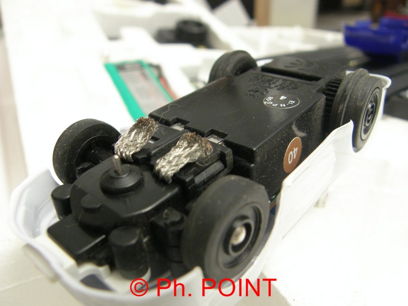 Pour avoir de la puissance au moment de la charge, la piste n'est pas alimentée par un transfo classique qui ne serait pas assez puissant mais un pack de batteries. Celui-ci est logé dans le boitier de la pitlane sous l'emplacement réservé au compte-tours disponible en option