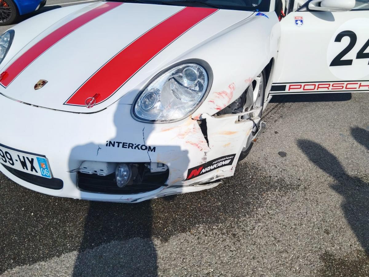 A cet instant, on arrive dans le double droit à l'autre bout du circuit. J'ai un passager dans la voiture, j'arrive très vite avec une voiture plus chargée, lorsque je commence mon dépassement je suis sur la bonne trajectoire, mais je ne peux plonger à la corde, puisque la Porche y est déjà ; alors que je sors de la trajectoire, je sens que mon auto commence à dériver vers l'extérieur. Tout va très vite, j'essaie de resserrer un peu, ma roue arrière décroche, le nez de la voiture pointe vers l'intérieur du virage, la Porsche me percute, je pars en tête-à-queue dans l'autre sens, c'est fini, je ne contrôle plus rien. Il ne reste plus alors qu'à serrer les freins et lâcher le volant pour éviter de se péter les poignets.