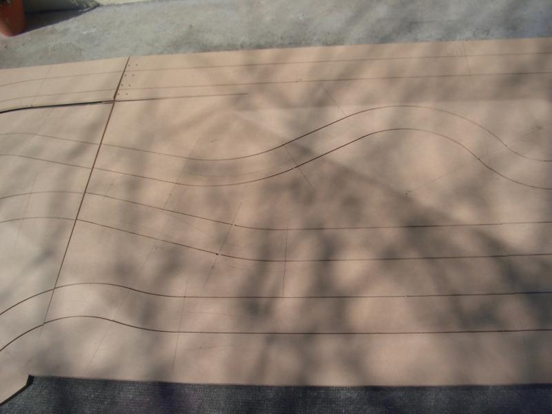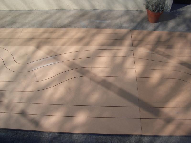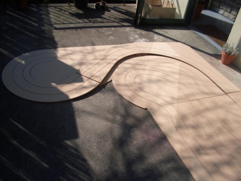 En fait je fais les virages au compas et ensuite je fais les lignes droites à la défonceuse en clouant une lame de parquet (à gauche de la défonceuse ) sur le MDF.