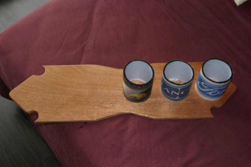 j'ai opté pour une petite planche de contre plaqué a qui j'ai donné une forme sympa et une couche de vernie.