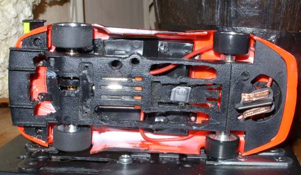 Cette aprem du temps à perdre j ai fouiller dans ma casse de voiture , et je voulais redonner vie à cette ferrari , j ai jouer de la dremel , j entend déja les puristes , à le cochon , ben oui messieurs , j ai drémélisé une ferrari , j en ai d autre ne vous faché pas , j ai tout démonté poids au depart 114 g , 90 à l arrivée , montage train AR et AV slot it , moteur orange slot it , chassis allégé façons HRS slot it , et voila , sur la piste ca change une petite bombe