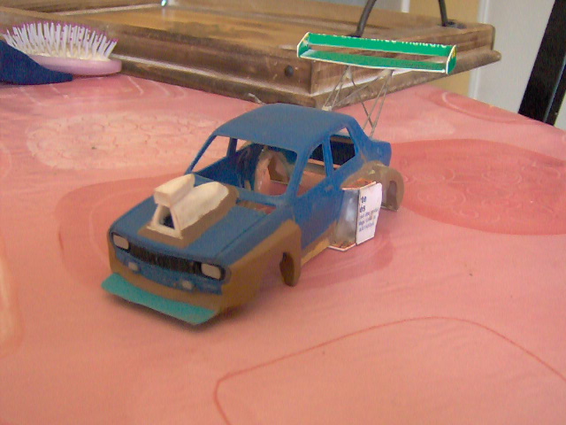Un chassis de subaru légérement rallongé, j'ai gardé l'habitacle le que j'ai repeind, un extincteur a pris la place du copilote, l'arceau modifié, axe arrière de F1, jantes...trouvé dans la casse et repeind .