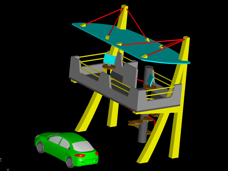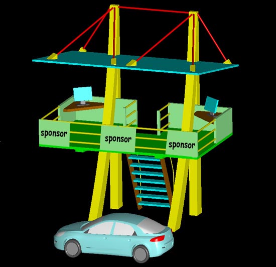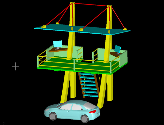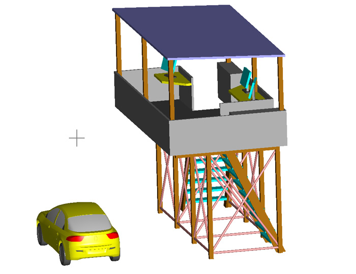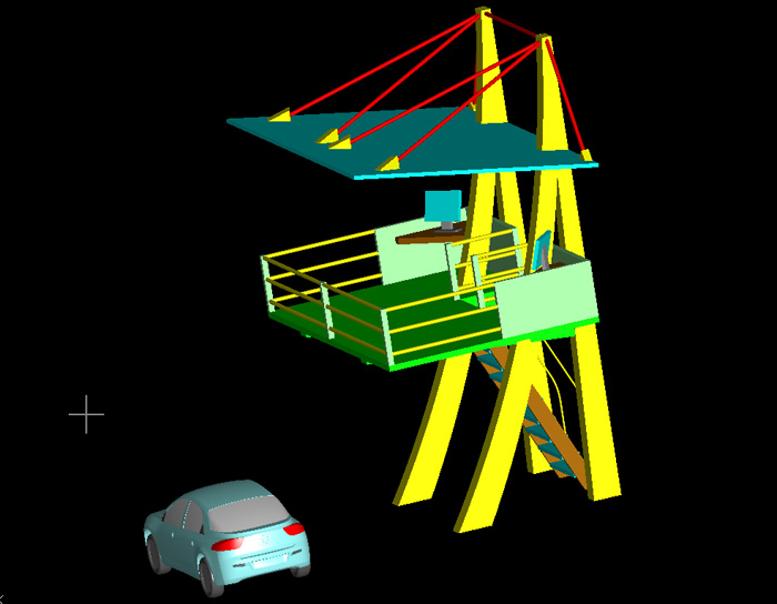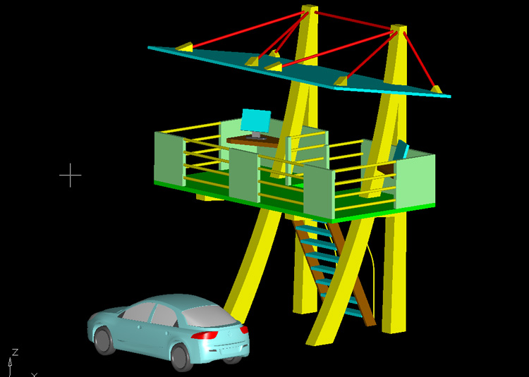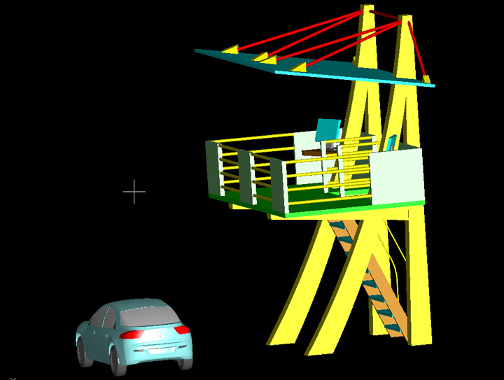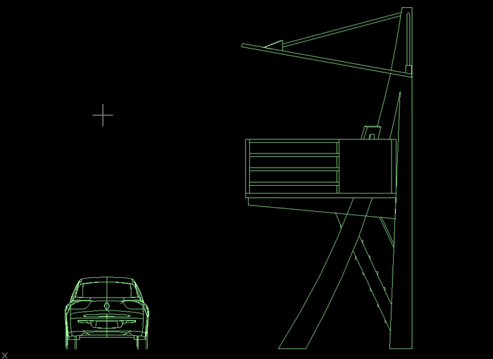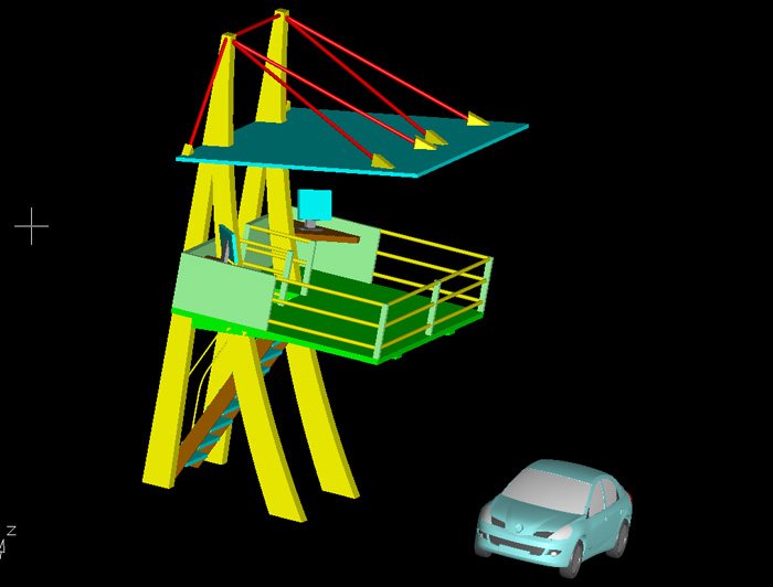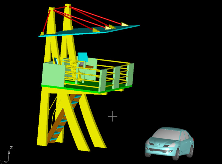 la cabine fait 200 mm de long (c'est pour celà que j'avais mis la bagniole pour voir les proportions) , je pense que les pieds sont bons , mais l'avancée en porte à faux est trog grande (je vais réduire ) et aussi les piliers sont un peu trop haut, ça va diminuer l'inclinaison des tirants.