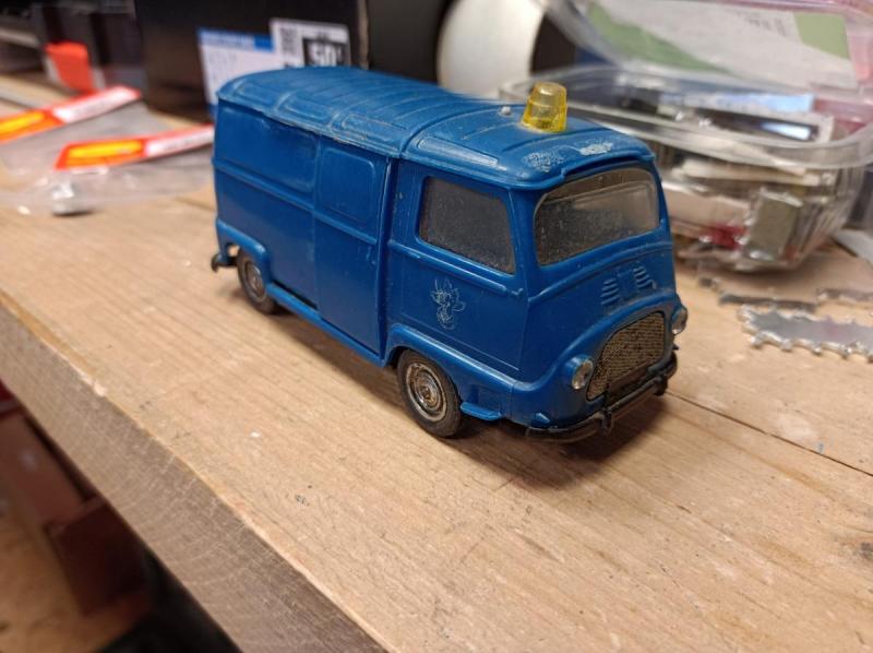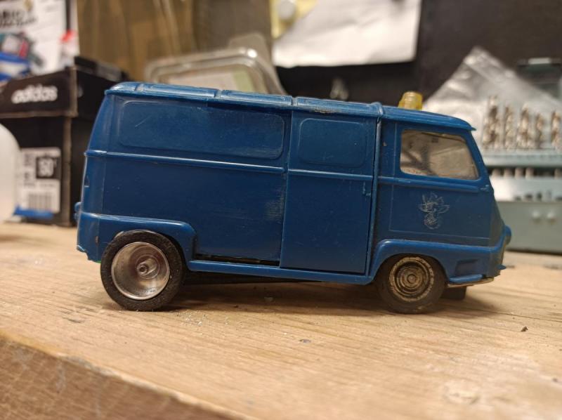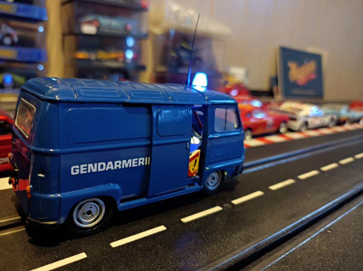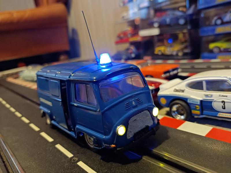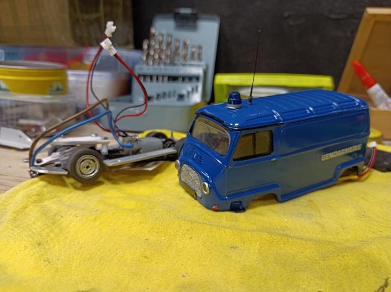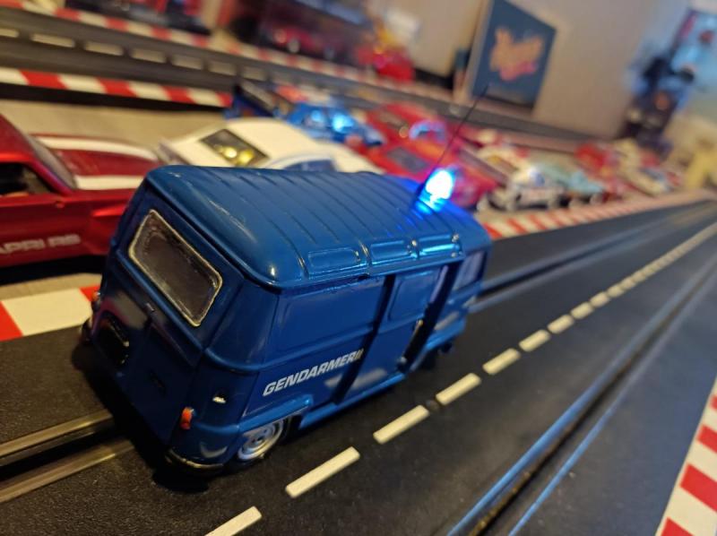 Salut a tous , j ai fini ou presque a une immat près une p'tite estafette gendarmerie. Il y a quelques semaines , avec femme et enfants , on est allé à un p'tit truc de broc' a 40 km de la maison ou l'on va souvent . Un p tit vendeur avait cette estafette minialuxe bien fatiguée qu il m a fait a 5 euros . J etait sans autos a faire , voilà de quoi s occupé. Mon principal soucis a et la hauteur de caisse , pas habitué à faire des châssis pour des trucs hauts sur pâtes, j ai du inventer un système pour un guide suspendu, a chaque nouveau châssis une nouvelle originalité après la suspension avant et arrière de la gs , le guide suspendu... La largeur aussi a été une galère , c'est étroit une estafette pour les châssis que je fait , y a fallu se creuser la tête et jouer de la lime et du dremel... Alors voilà après bien des soucis et un châssis qui a cassé dans la dernière ligne droite , l estafette est finie et finalement roule pas si mal , en tous cas elle se déplace !