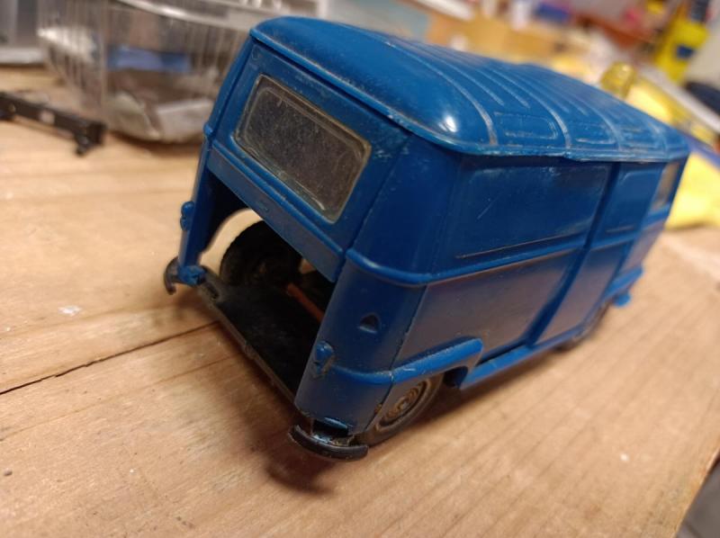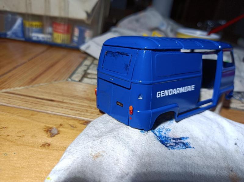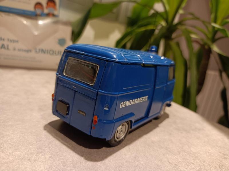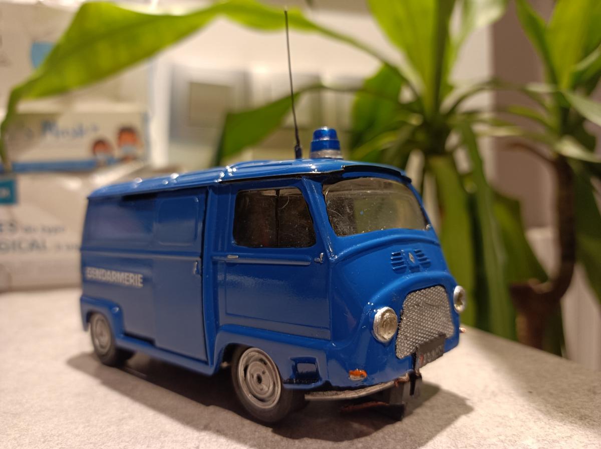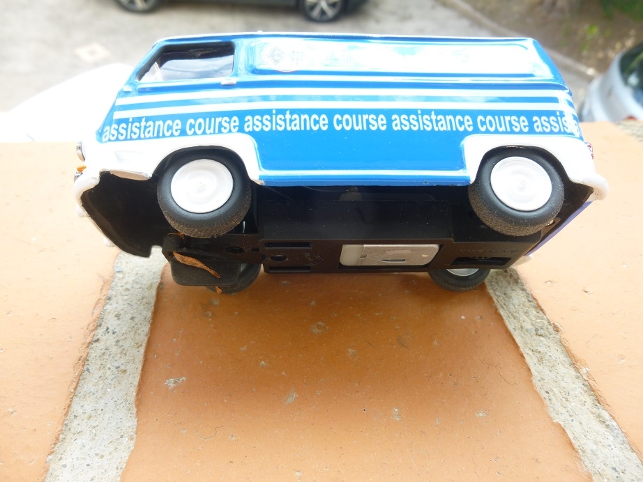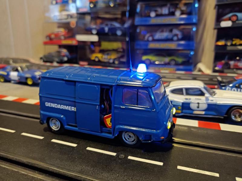 Salut a tous , j ai fini ou presque a une immat près une p'tite estafette gendarmerie. Il y a quelques semaines , avec femme et enfants , on est allé à un p'tit truc de broc' a 40 km de la maison ou l'on va souvent . Un p tit vendeur avait cette estafette minialuxe bien fatiguée qu il m a fait a 5 euros . J etait sans autos a faire , voilà de quoi s occupé. Mon principal soucis a et la hauteur de caisse , pas habitué à faire des châssis pour des trucs hauts sur pâtes, j ai du inventer un système pour un guide suspendu, a chaque nouveau châssis une nouvelle originalité après la suspension avant et arrière de la gs , le guide suspendu... La largeur aussi a été une galère , c'est étroit une estafette pour les châssis que je fait , y a fallu se creuser la tête et jouer de la lime et du dremel... Alors voilà après bien des soucis et un châssis qui a cassé dans la dernière ligne droite , l estafette est finie et finalement roule pas si mal , en tous cas elle se déplace !