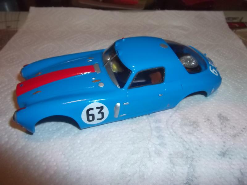 Peinture refaite, bleu métal Tamiya TS53. Blanche, à faire, Tamiya blanc racing TS07. Peinture jaune au pinceau, puis lustrée (hyper lustrée).