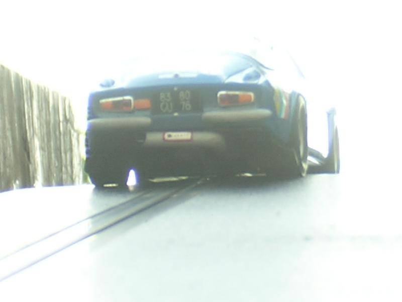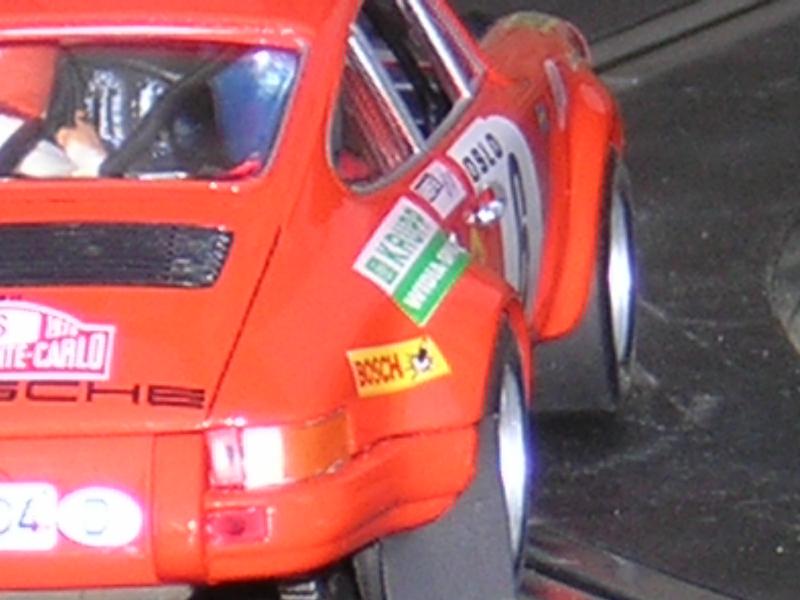 Décalques : bande adhésive rouge sur le haut des enjoliveurs de phare, logo Shell sur l’aile avant gauche, marque Porsche suivi d’une bande noire sur les pas de porte, coupe circuit, carré blanc point rouge sur la custode arrière gauche