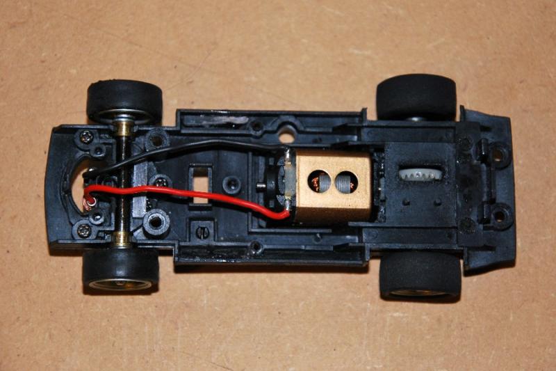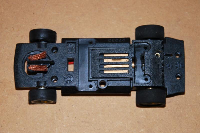 Le châssis, débarrassé de toute la câblerie des phares et des différents éléments du guide d’origine est plus « aéré » avec un guide court (Slot It ?) avec ressort et un moteur GMC.
