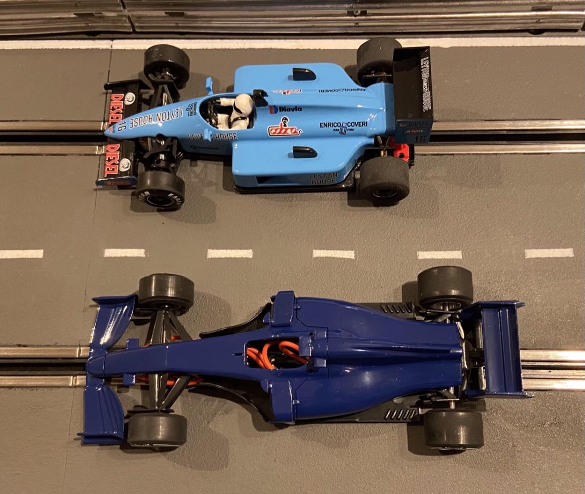 Sans aucune autre modification, la voiture est conduisible dès la sortie de boîte, mais sans plus: les pneus arrière glissent beaucoup (je roule sur du Carrera peint) et effectivement les roues avant ne touchent pas la piste.