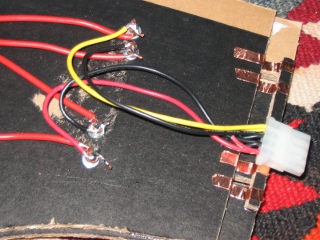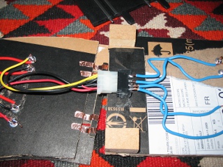 Comme ce n'était pas évident d'avoir de bons contacts entre 2 rails, j'ai démonté des prises molex d'alim/disques durs de PC.