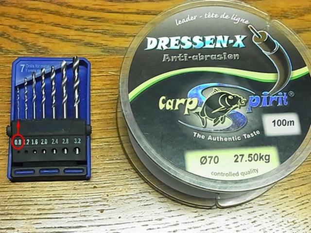 Ensuite je coupe 6mm de fil de pêche au gros diam. 0,75mm : ce fil reste légèrement souple et peut donc encaisser un choc ultérieur.