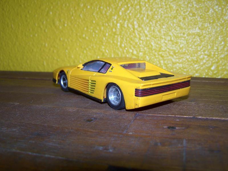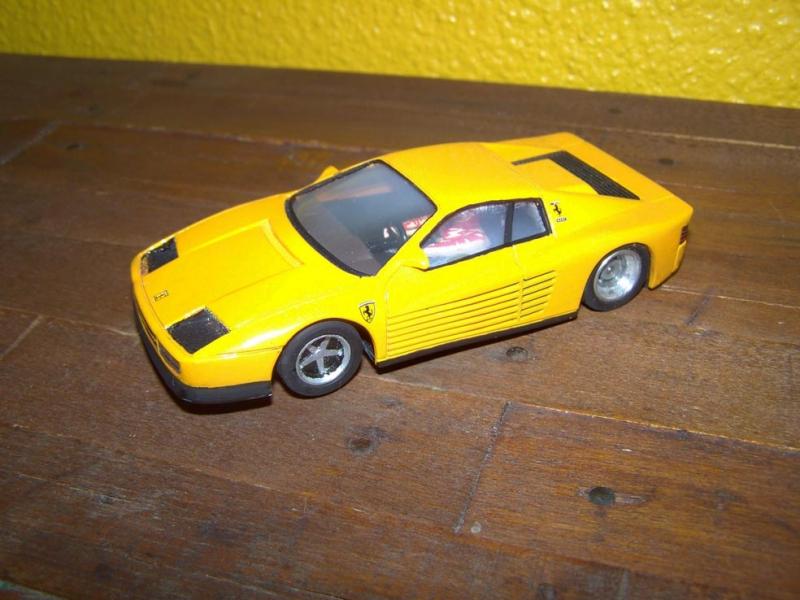 L'une des plus faciles fut cette petite Testarossa, à friction en vente dans les stations service sur l'autoroute. Lorsque je l'ai achetée, elle était orange avec des roues vertes (si ! le gars qui avait choisit les couleurs avait sans doute une revanche à prendre sur Ferrari) pas d’intérieur et des vitres opaques noires. Je me suis donc appliqué à faire un intérieur, des vitres en emballage de salade et d' y introduire un pilote.