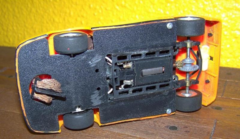 Le chassis lui était une hybridation étrange, l'avant demeurait celui du jouet, sur lequel j'avais installé un support de guide, mais l'arrière était un chassis SRS1 de SCX, le meilleur chassis de l'époque et pour tout dire cette petite auto roulait plutôt bien!