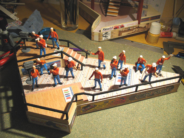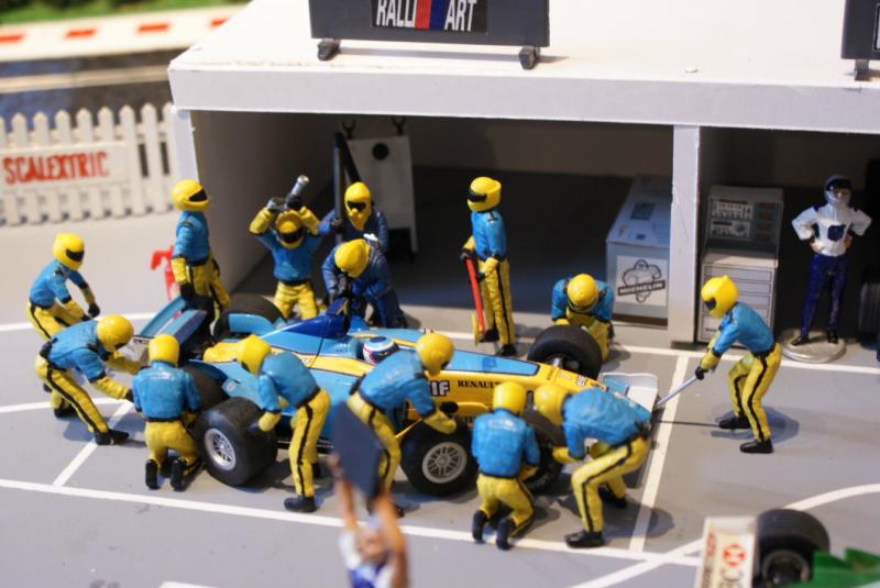 Carrera, Scalextric, Scx, entre autres marques proposent des lots de figurines constituant une équipe de stand en action autour d'une F1 (non fournie).