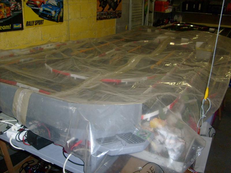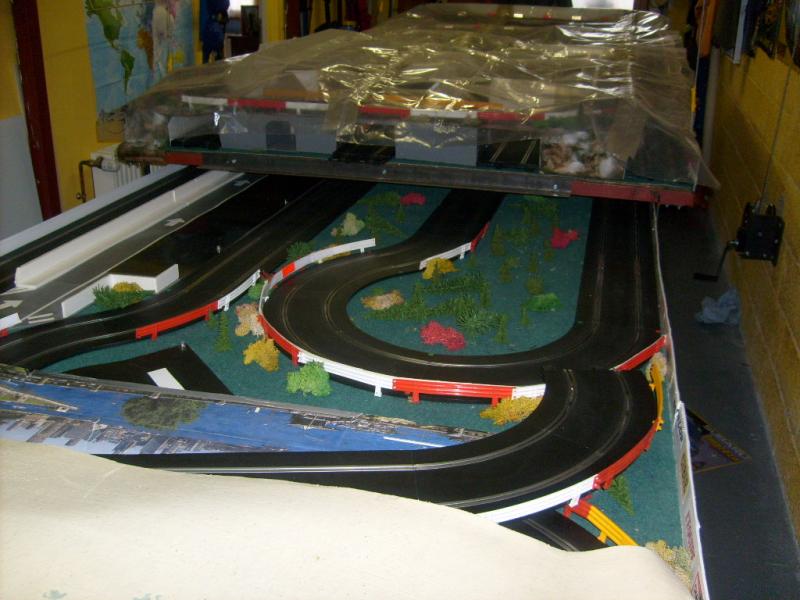 rangement des décors,séparation du circuit,couverture de la piste puis superposition des 2 plaques puis élévation :