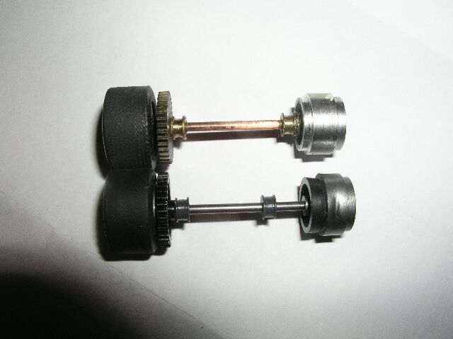 la photo est plus parlante,en haut axe avec roues et pneus d'origine et en bas roues rectifiées et pneu Ninco, on voit la rectification en noir sur la roue droite.