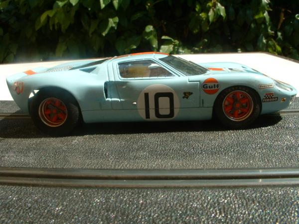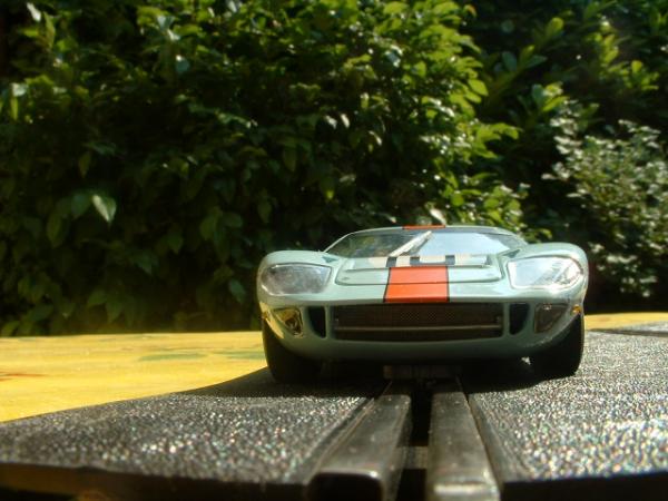 GT 40 : vire les pneus avant pour des plus fins . Vire les arrières pour des moins hauts ( NSR , Slot It , Ninco ou n'importe quoi d'autre)et + efficaces que les fly d'origine qui vont maintenant te servir à faire des tas de pneus de bord de piste ( à moins que tu ne les brules car c'est , en gros , tout ce qu'ils méritent ...)et tu lui colles 5 grammes dans le nez juste derrière le guide . Verifie que ta couronne et tes pneus arrières ne frottent pas après les ailes et le support moteur aussi , c'est un grand classique de chez Fly et sur la GT40 c'est catastrophique .....au besoin tu limes un peu et tu mets une entretoise .