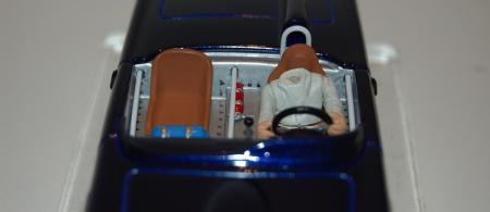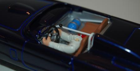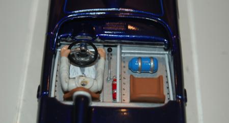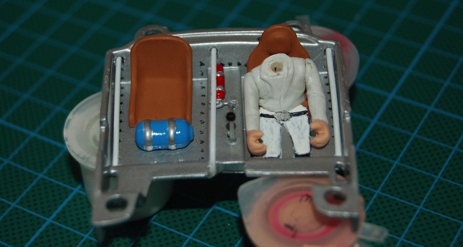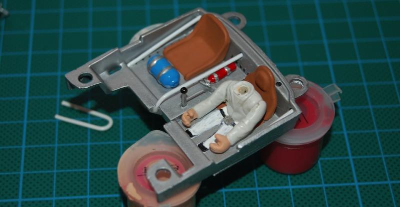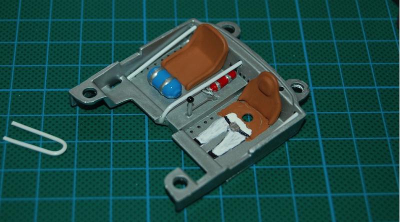Bon, comme les photos marchent de nouveau ... place à l'habitacle avec quelques détails rajoutés (arceaux, nos, levier de vitesse, extincteur), le bas du corps du pilote et l'assise du siège en trompe l'oeil :