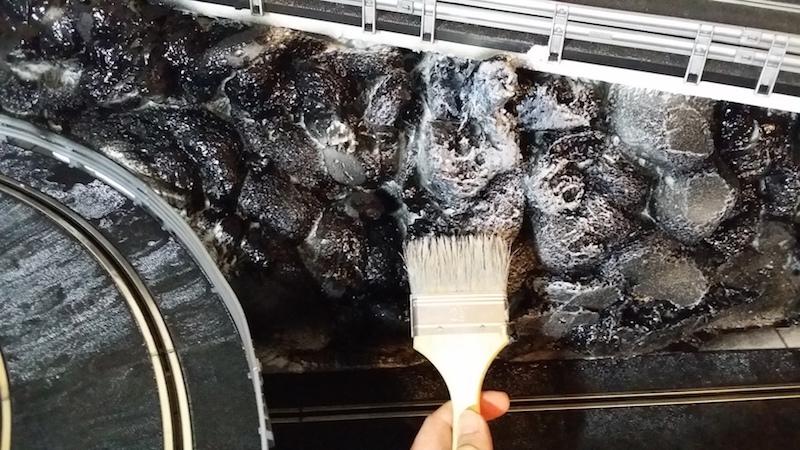 je m’étais inspiré du site de medslotring, il préparait de l'enduit assez crémeux, il trempait des morceaux de tee shirt jusqu’à ce qu’ils soient bien chargés, puis il les étalait sur le grillage.