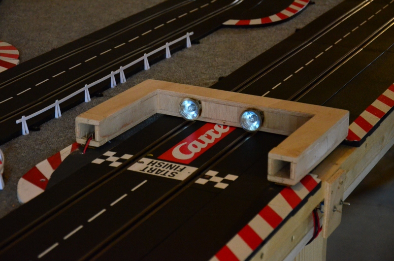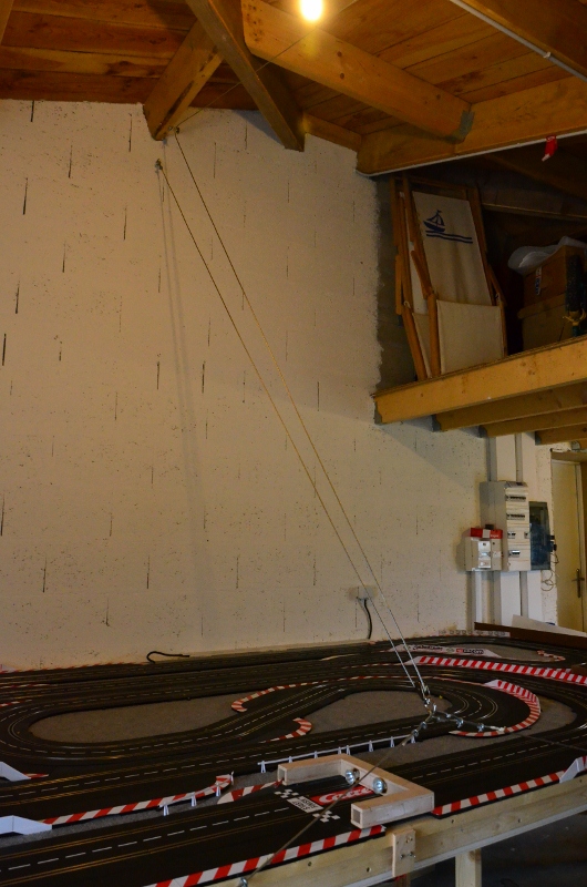 ce joli pont n'est pas peint, faut que je trouve des spots à led, là, ils sont halogènes en 12 V (car alimentés par le pc) et ça chauffe un peu trop pour de la peinture! En attendant, il se couche quand le circuit remonte. Deux charnières et roule ma poule!