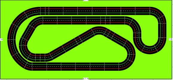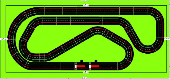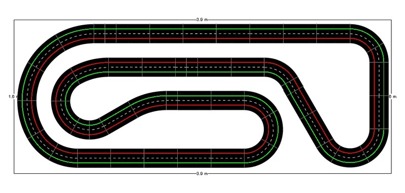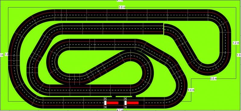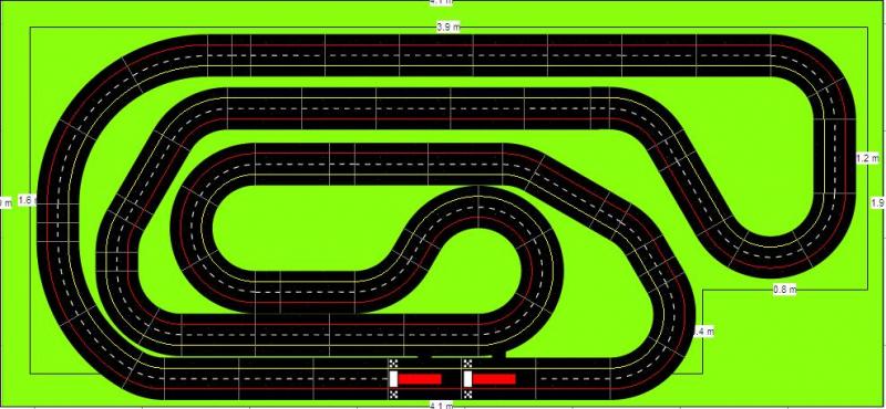 Après de longs mois de négo, j'ai réussi à faire accepter par le conseil d'administration familial l'implantation d'une piste fixe dans le garage, et ce grâce à Tsorp et à son Poulotodrome. Je me suis inspiré de son tracé pour faire ça. Comme le Poulotodrome, la piste se relèvera latéralement sur un mur. Les dimensions utiles sont 3,90 X 1,60. C'est du Carrera