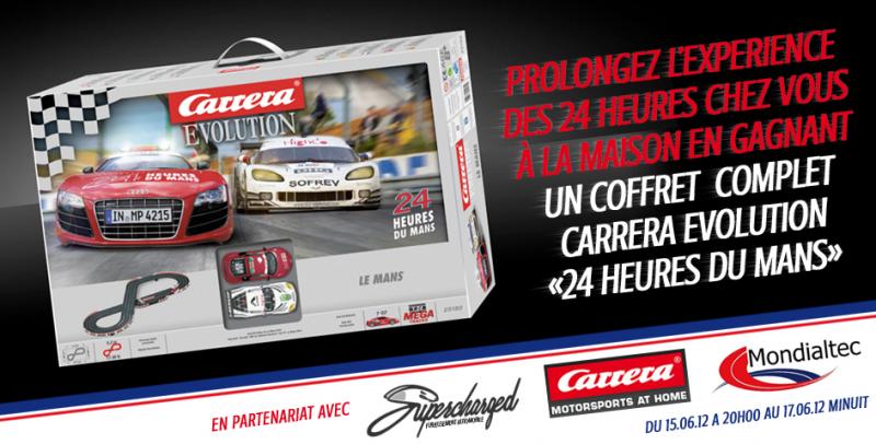 Alors que le départ de l’édition 2012 des célèbres 24 Heures du Mans sera donné demain à 15 Heures, Supercharged s’est associé à la boutique Mondialtec et au fabricant Carrera pour vous permettre de prolonger l’expérience ces 24 Heures chez vous, à la maison, en gagnant un coffret Carrera Evolution 1/32 « 24 Heures du Mans » complet comprenant 5,33 mètres de piste, une Chevrolet Corvette C6R Luc Alphand Aventures « No.72″ Le Mans 2010 et une Audi R8 Safety Car Le Mans 2010 ainsi que tout le nécessaire pour les faire rouler. Vous avez jusqu’à dimanche soir minuit pour participer, tous les détails du concours sur Supercharged par ici :