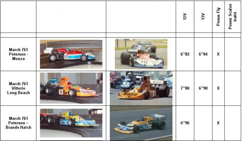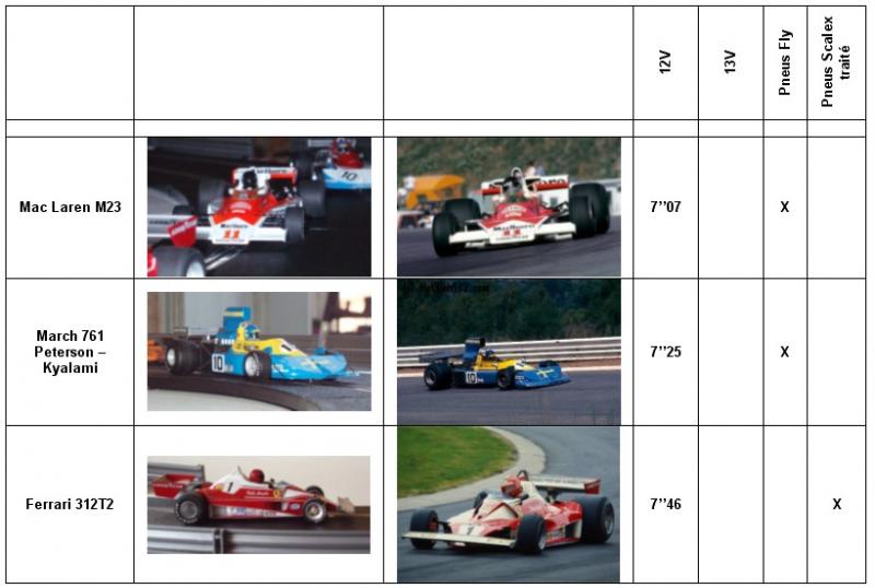 - La supériorité des gommes Fly sur une piste Scalex: La M23 qui est équipée maintenant des pneus March Fly a réduit l'écart qui la séparait des March (7/10e auparavant) et devient maintenant beaucoup plus plaisante. La 312T2 qui est encore en pneus Scalex est larguée (en plus la Ferrari est plus pointue avec ses voies étroites et son empattement court)