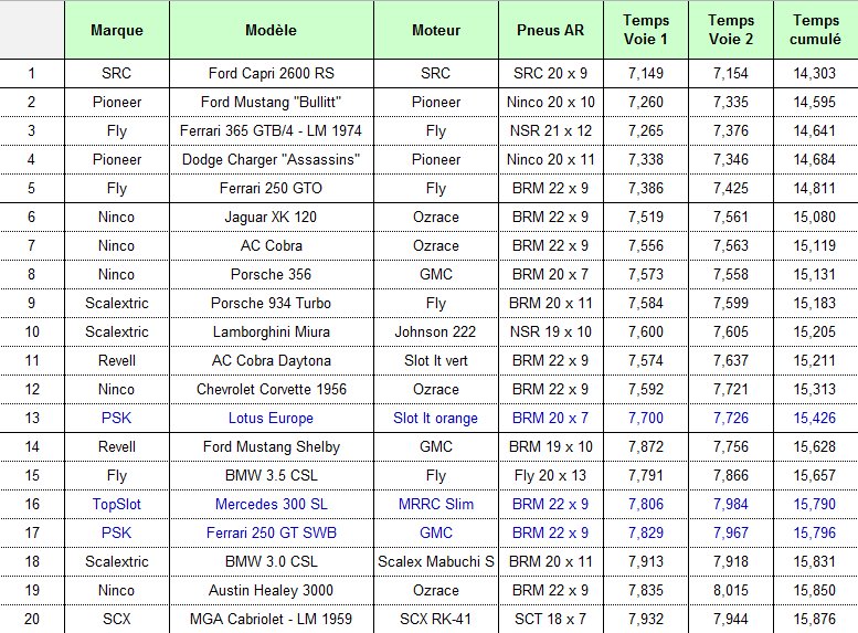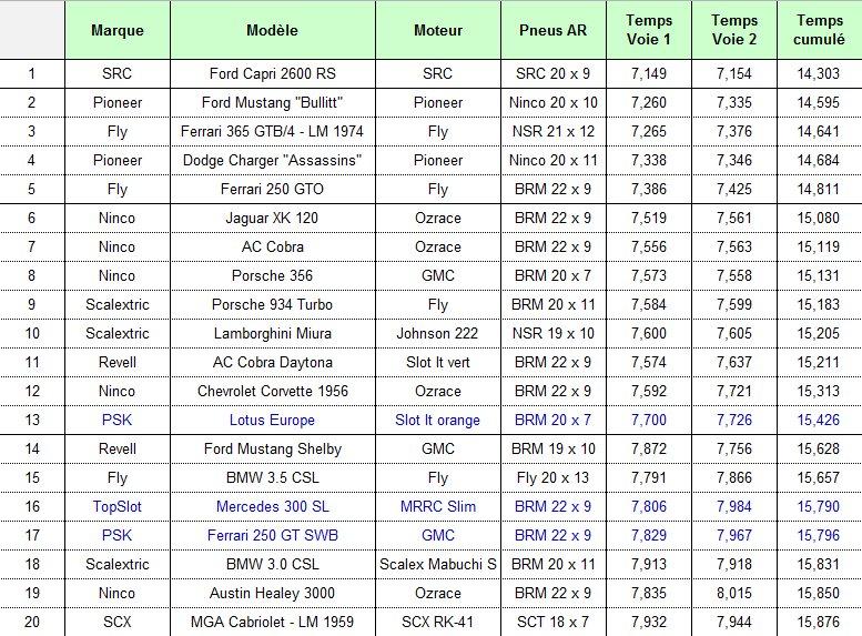 Petite mise à jour du tableau des "Anciennes". Ce tableau récapitule l'ensemble des voitures de cette catégorie capables de tourner sur les 2 voies avec un temps global inférieur à 16 s.