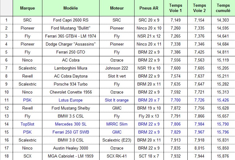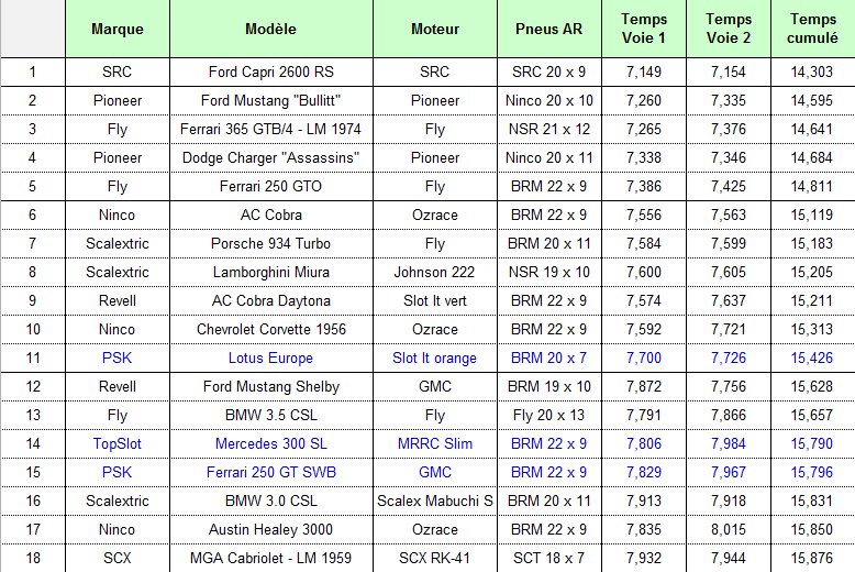 - des voitures « Classic » des marques suivantes : Fly, Ninco, Revell, SCX et SRC,- les « muscles-cars » Pioneer, issues du film "Bullitt",