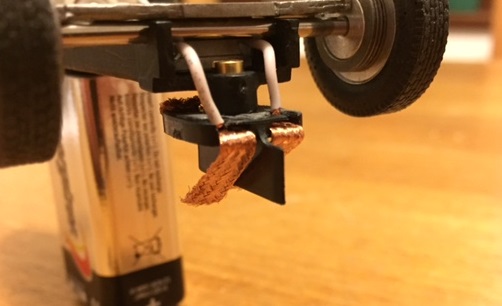 De mémoire, j'ai dû réduire l'épaisseur du puit de guide au maximum et souder les fils aux tresses pour que les roues avant soient bien en contact avec la piste.