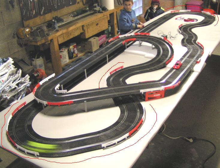 Malheureusement, faute de travaux dans la maison, je l'ai démonté (sniff). Le futur emplacement du circuit sera les combles que je suis en train de terminer = salle de jeux pour les enfants et le vieux bouc de père (surnom donné par mes enfants mais avec beaucoup de tendresse) et une pièce bureau pour ma petite femme.