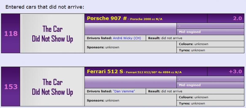 L'extrait de tableau racingsportscars que tu montres ,concerne les voitures inscrites ( ou pré engagées) et qui ne se sont pas presentées à la course . Pas de 512S au tour auto .