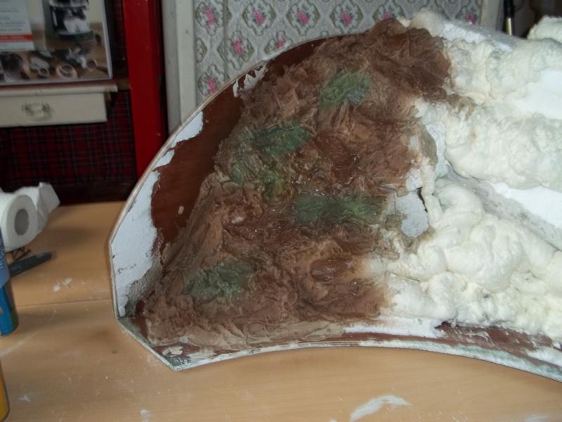 pour le platre, j ai fait 2 couches, une assez epaisse (un truc un peu genre pate a tartinier liquide) mélangé a du sablon et de la litiere pour chat (un truc avec la litiere, mouille la avant sinon le platre tire beaucoup trop vite) que tu apliqueras soit au gros pinceaux a papier peint ou a la main (perso)