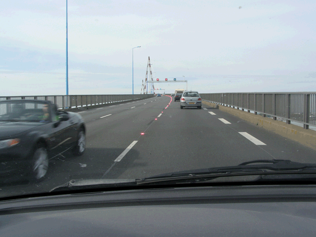 Je me suis permis une petite journée en famille à Saint-Brévin-les-Pins aujourd'hui. En passant sur le pont de Saint-Nazaire celui-ci a été aménager en zone expérimentale concernant les sens de circulations de la voie centrale qui peut être alterné grâce à un système d'éclairage à led et des portiques de signalisation. Je trouve ce système génial, sécurisant et bien plus visible que les bandes blanche qui s'efface avec le temps.
