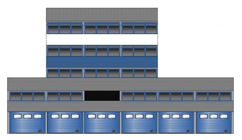 L'avantage de ces bâtiments, à part pour les boxes, c'est que tu n'es pas obligé de faire des ouvertures : tu traces les baies vitrées et tu peins le papier en marron très foncé, ensuite tu colles du plastique transparent dessus pour donner l'aspect du verre. Après tu colles sur le plastique les encadrements bleus que tu peux réaliser avec des allumettes ou autre.