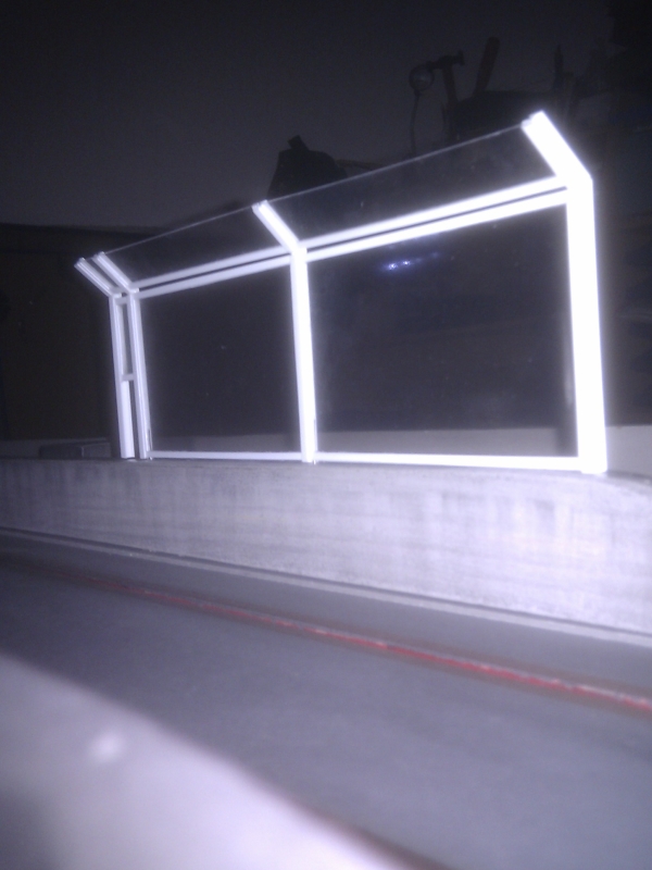 Le plat sert à faire les contours des vitres. Ils sont collés à celle-ci avec le Micro Kristal Klear. Une fois sec, ponçage léger des tranches de la fenêtre, puis des extrémité des pylônes.